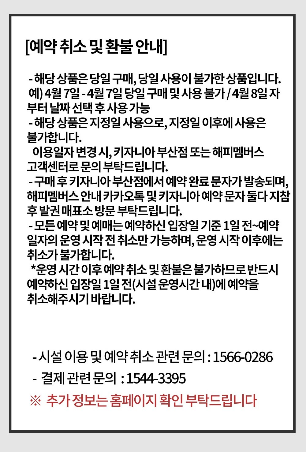 *운영 시간 이후 예약 취소 및 환불은 불가하므로 반드시 예약하신 입장일 1일 전(시설 운영시간 내)에 예약을 취소해주시기 바랍니다.