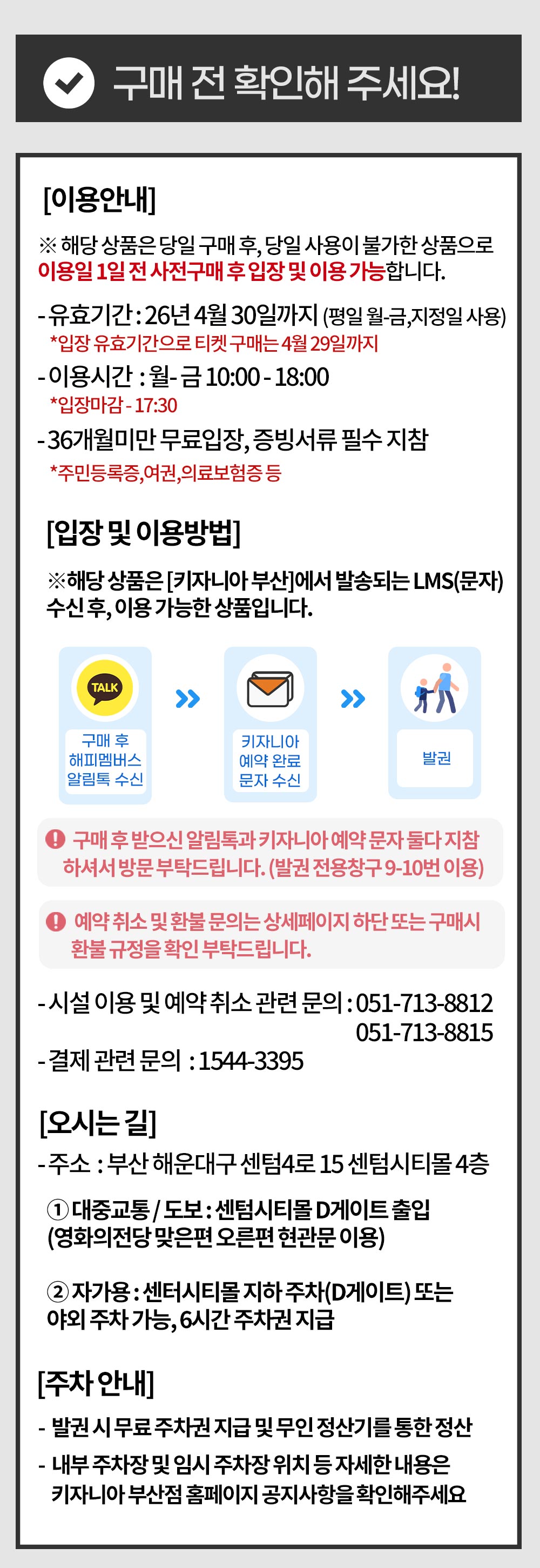 - 구매 후 키자니아 부산점에서 예약 완료 문자가 발송되며, 해피멤버스 안내 카카오톡 및 키자니아 예약 문자 둘다 지참 후